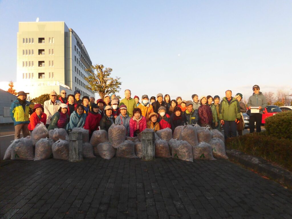 3日前の初雪以来急に寒さが増した中、早朝より市役所の清掃作業が行われました。先に何ヵ所にも集められて居た落ち葉を市の収集袋に詰めこんだところ35個も有りました。集合写真撮影とCLの説明後、農家からの無料の柿とYさんからの差し入れ柑橘を頂き、市役所を7:50分出発。